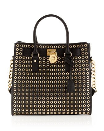 Michael Kors Black Leather Hamilton Large Grommet Tote Shoulder Bag Handbag PurseOverviews.